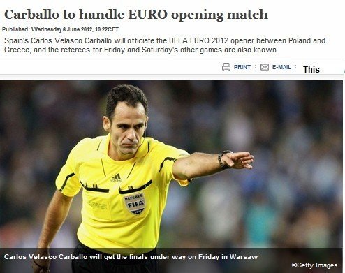 腾讯体育讯 当地时间6月6日上午11时,欧足联官方公布了执法2012欧洲杯赛揭幕战的主裁判人选,来自西班牙的裁判卡洛斯-贝拉斯科-卡尔巴罗将执法周五波兰队同希腊队的揭幕战。
