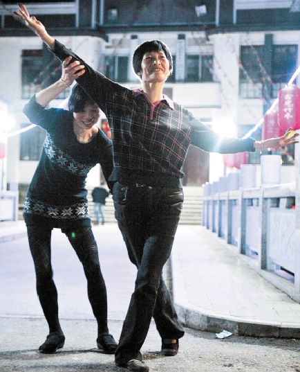 夜幕下,33岁的吴小兰正在教55岁的吴晓媚跳广场舞。 本报记者 盛高 摄