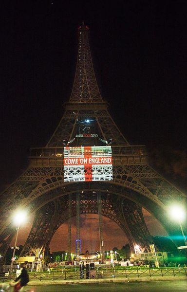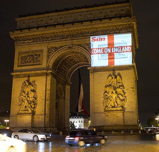 英国《太阳报》就派出工作人员将巨幅的英格兰圣乔治十字旗,投影到了埃菲尔铁塔和凯旋门上。用《太阳报》自己的说法就是“我们已经帮助英格兰先得一分。”