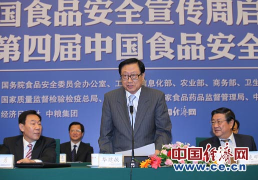 6月11日至17日被确定为今年的全国食品安全宣传周。宣传周主题为“共建诚信家园 同铸食品安全”。全国食品安全宣传周启动仪式由国务院食品安全委员会办公室、工业和信息化部、农业部、商务部、卫生部、国家工商总局、国家质检总局、国家粮食局、国家食品药品监管局、中国科协共同主办,经济日报社、中粮集团承办,中国经济网执行承办。图为全国人大常委会副委员长华建敏宣布全国食品安全宣传周启动 裴小阁摄