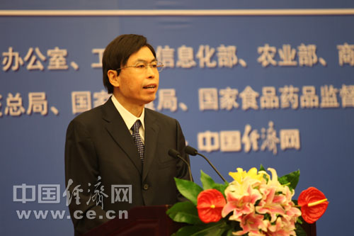 6月11日至17日被确定为今年的全国食品安全宣传周。宣传周主题为“共建诚信家园 同铸食品安全”。全国食品安全宣传周启动仪式由国务院食品安全委员会办公室、工业和信息化部、农业部、商务部、卫生部、国家工商总局、国家质检总局、国家粮食局、国家食品药品监管局、中国科协共同主办,经济日报社、中粮集团承办,中国经济网执行承办。图为商务部部长助理房爱卿 裴小阁摄