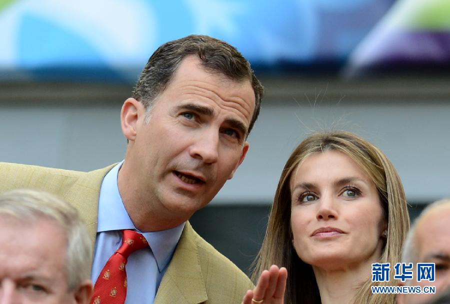 6月10日,西班牙王子费利佩(左)和王妃莱蒂西娅在现场观看比赛。当日,在波兰格但斯克体育场进行的2012欧洲足球锦标赛C组首轮比赛中,西班牙队以1比1战平意大利队。新华社记者刘力航摄
