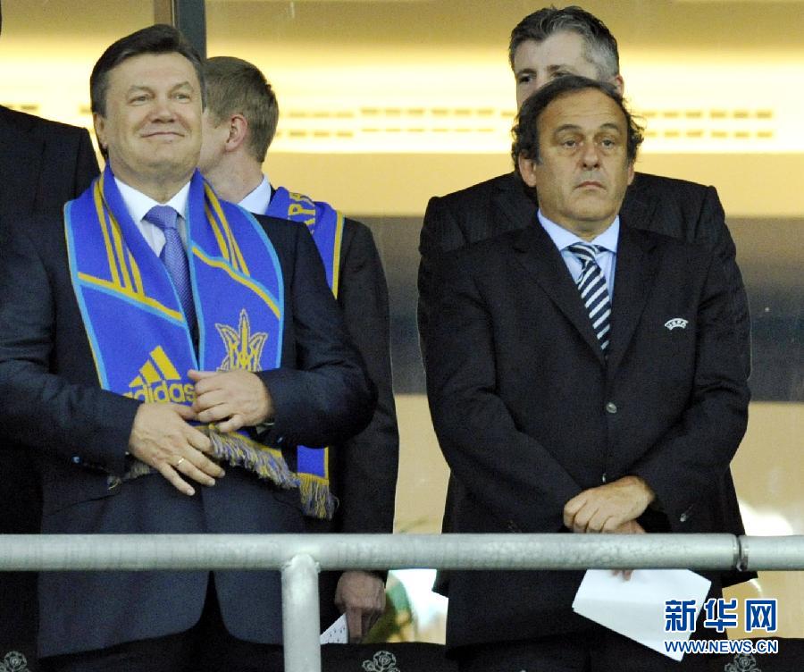 6月11日,欧足联主席普拉蒂尼(前右)观战。当日,在乌克兰首都基辅进行的2012欧锦赛D组首轮比赛中,乌克兰队对阵瑞典队。 新华社记者马宁摄