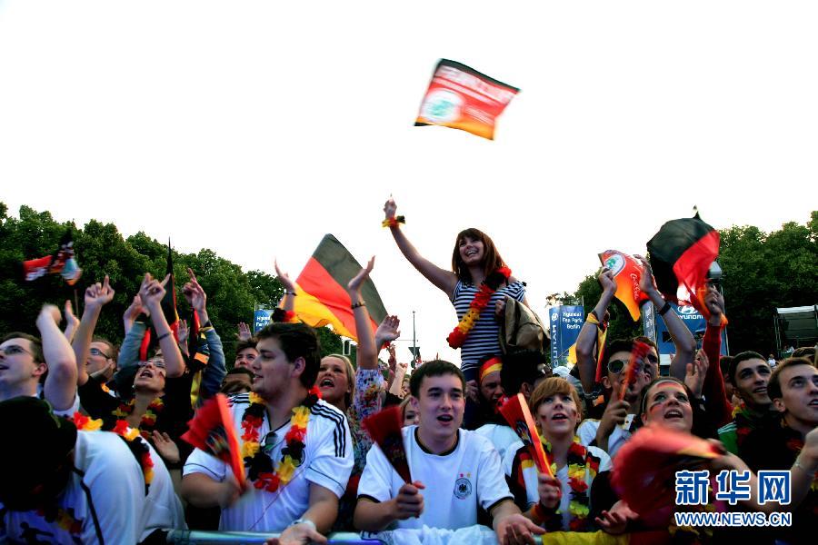 6月13日,柏林球迷聚集在勃兰登堡门前广场上为德国队的进球欢呼。新华社记者潘旭摄