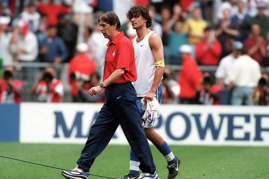 1998年7月3日,时任意大利国家队主教练切萨雷-马尔蒂尼和担任国家队队长的儿子保罗-马尔蒂尼在一起。