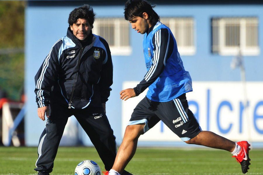 2009年10月8日,阿根廷布宜诺斯艾利斯,马拉多纳和阿奎罗在训练场上。马拉多纳是阿奎罗的岳父。