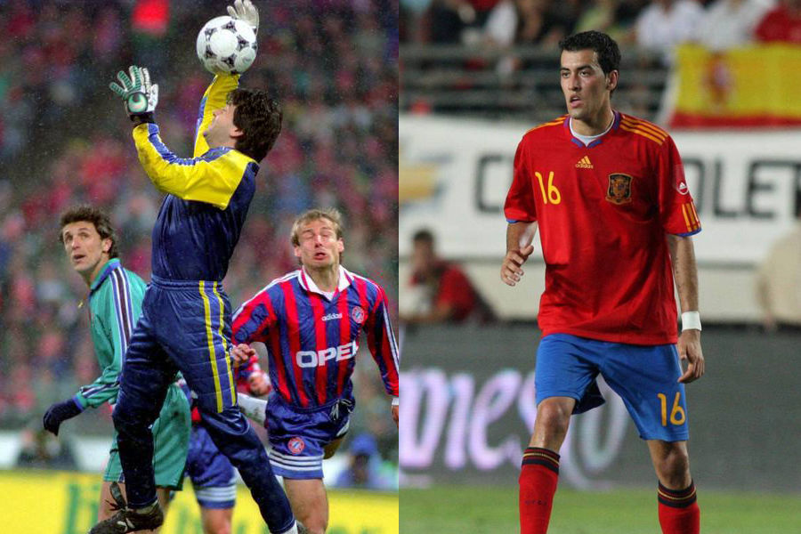 左图:1996年4月2日,西班牙国脚塞尔吉-布斯克茨的父亲、巴塞罗那门将卡洛斯-布斯克茨与克林斯曼争抢。右图:2010年6月8日,西班牙国脚塞尔吉-布斯克茨在球场上。
