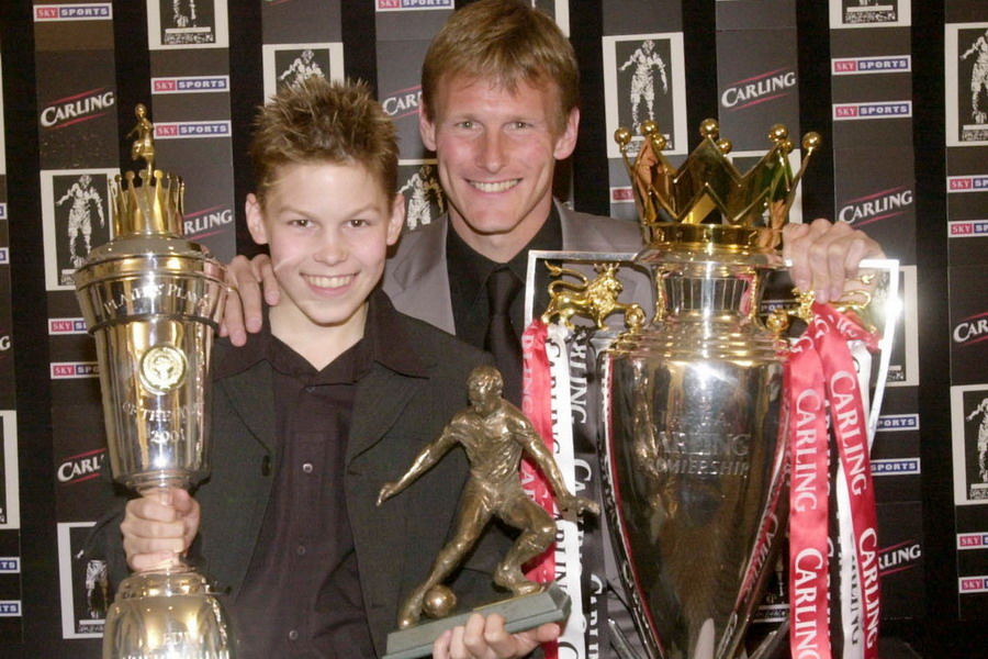 2001年5月10日,英格兰传奇前锋泰迪谢林汉姆和儿子查理-谢林汉姆一起展示奖杯。