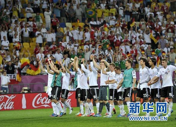 6月17日,德国队球员在赛后向球迷致谢。当日,在乌克兰利沃夫进行的2012欧洲足球锦标赛B组最后一轮比赛中,德国队以2比1战胜丹麦队,从而以三战全胜列小组第一出线。新华社记者马宁摄
