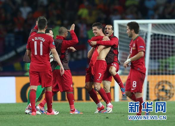 6月17日,葡萄牙队球员在赛后庆祝胜利。当日,在乌克兰哈尔科夫举行的2012欧洲足球锦标赛B组比赛中,葡萄牙队以2比1战胜荷兰队,以2胜1负积6分的成绩位列小组第二名,晋级八强。新华社记者孟永民摄