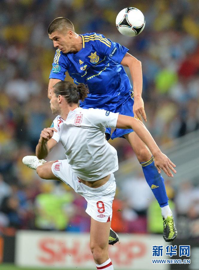 6月19日,英格兰队球员卡罗尔(下)与对手在比赛中争顶。当日,在乌克兰顿涅茨克顿巴斯竞技场进行的2012欧锦赛D组第三轮比赛中,乌克兰队以0比1不敌英格兰队,未能小组出线。 新华社记者李勇摄