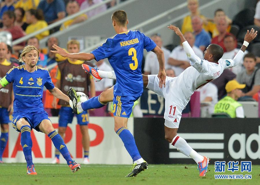 6月19日,英格兰队球员阿什利·扬(右)与乌克兰队球员季莫申科(左)在比赛中拼抢。当日,在乌克兰顿涅茨克顿巴斯竞技场进行的2012欧锦赛D组第三轮比赛中,乌克兰队以0比1不敌英格兰队,未能小组出线。 新华社记者李勇摄
