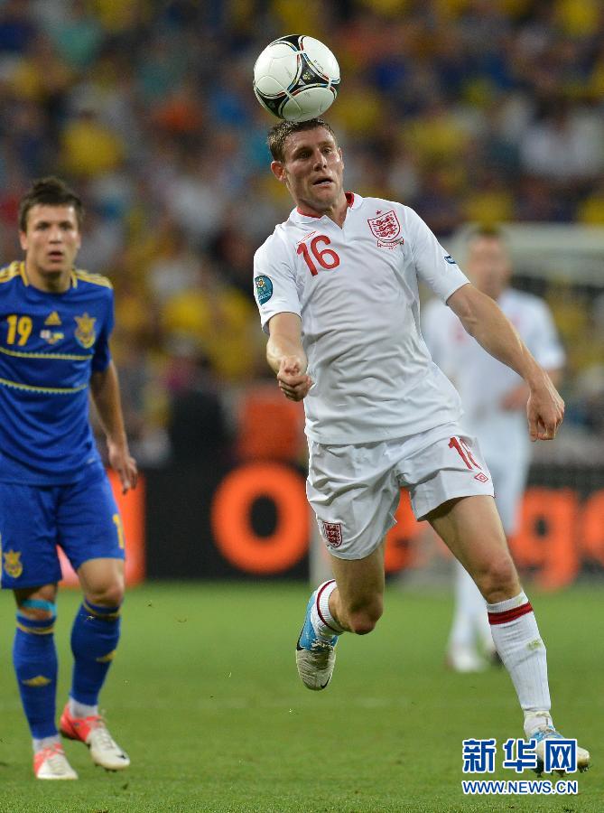 6月19日,英格兰队球员米尔纳(右)在比赛中争顶。当日,在乌克兰顿涅茨克顿巴斯竞技场进行的2012欧锦赛D组第三轮比赛中,英格兰队以1比0战胜乌克兰队,晋级八强。 新华社记者李勇摄
