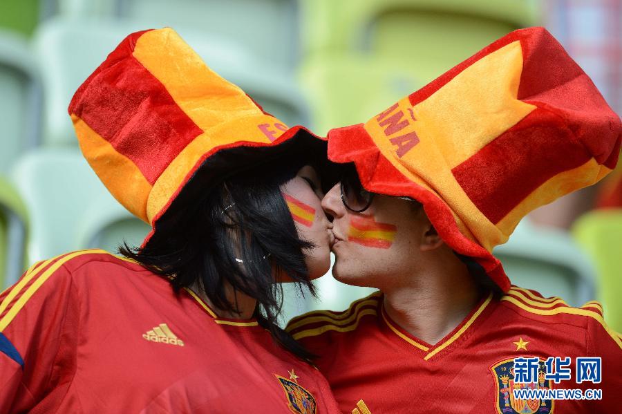 6月10日,一对情侣在赛前接吻。当日,在波兰格但斯克体育场进行的2012欧洲足球锦标赛C组首轮比赛中,西班牙队对阵意大利队。新华社记者刘力航摄