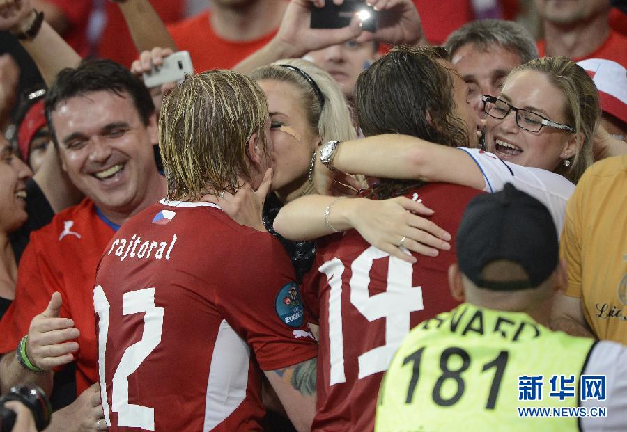 6月16日,捷克队球员拉伊托拉尔(前左)、杰拉切克(前右)赛后与看台上的亲友庆祝胜利。当日,在波兰弗罗兹瓦夫进行的2012欧洲足球锦标赛A组第三轮比赛中,捷克队以1比0战胜波兰队,晋级八强。 新华社记者武巍摄