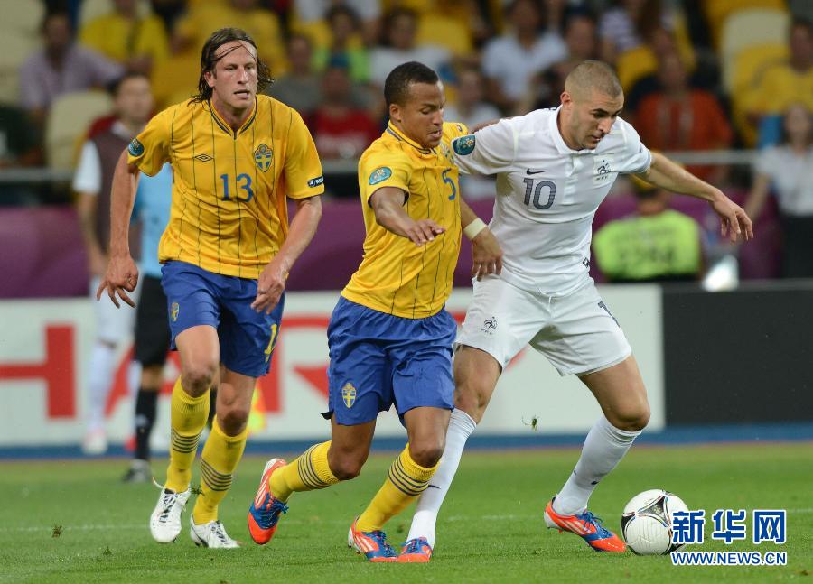 法国队球员本泽马(右)与瑞典队球员马·奥尔森(中)在比赛中拼抢。当日,在乌克兰首都基辅进行的2012欧锦赛D组第三轮比赛中,法国队以0比2负于瑞典队,但仍以1胜1平1负的战绩排名小组第二晋级八强。新华社记者马宁摄