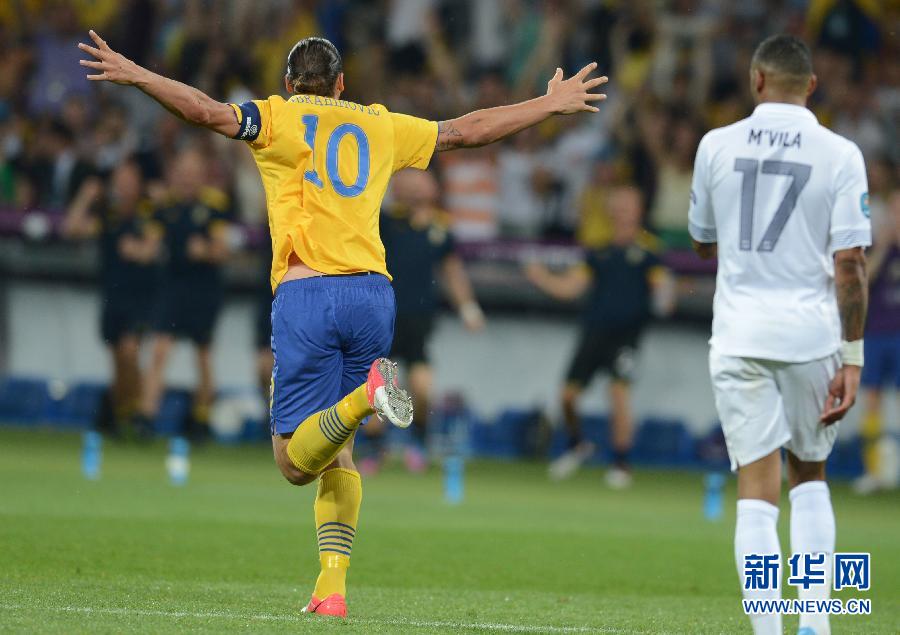 6月19日,瑞典队球员伊布拉希莫维奇(左)在进球后庆祝。当日,在乌克兰首都基辅进行的2012欧锦赛D组第三轮比赛中,瑞典队对阵法国队。 新华社记者李俊东摄