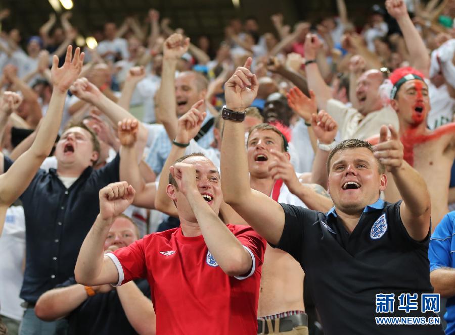 6月19日,英格兰队球迷庆祝胜利。当日,在乌克兰顿涅茨克顿巴斯竞技场进行的2012欧锦赛D组第三轮比赛中,英格兰队以1比0战胜乌克兰队,晋级八强。 新华社记者孟永民摄
