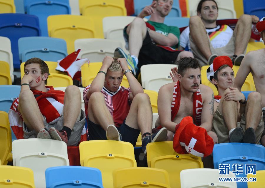 6月17日,比赛结束后丹麦球迷神情木然。当日,在乌克兰利沃夫进行的2012欧洲足球锦标赛B组最后一轮比赛中,德国队以2比1战胜丹麦队,从而以三战全胜列小组第一出线。新华社记者李俊东摄