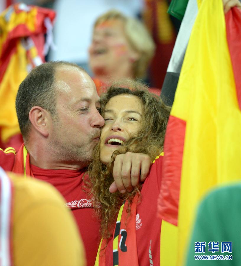 6月18日,西班牙队球迷在赛后亲吻庆祝胜利。当日,在波兰格但斯克举行的2012欧洲足球锦标赛C组最后一轮比赛中,西班牙队以1比0战胜克罗地亚队,从而以两胜一平列小组第一出线。新华社记者刘力航摄