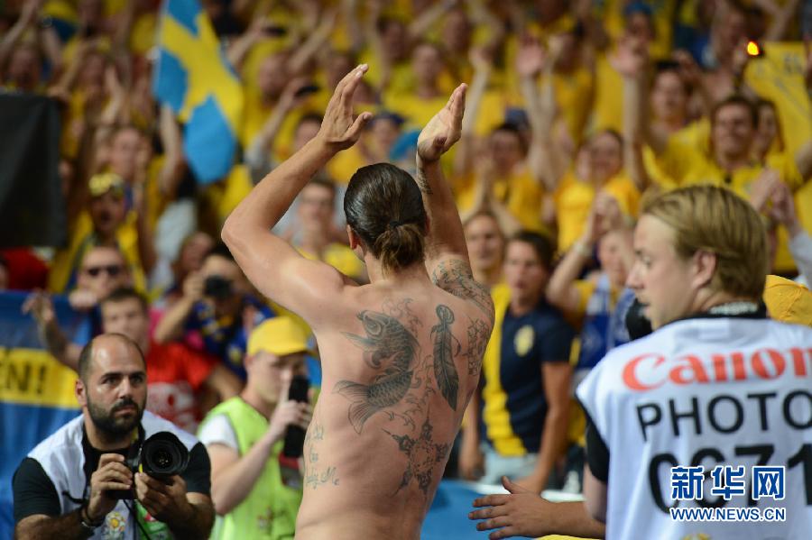 6月19日,瑞典队球员伊布拉希莫维奇(前中)在赛后将球衣送给球迷后向球迷致意。当日,在乌克兰首都基辅进行的2012欧锦赛D组第三轮比赛中,法国队以0比2负于瑞典队,但仍以1胜1平1负的战绩排名小组第二晋级八强,瑞典队赛前已提前出局。新华社记者李俊东摄