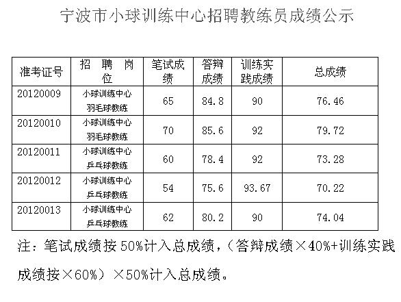 宁波市小球训练中心招聘教练员成绩公示