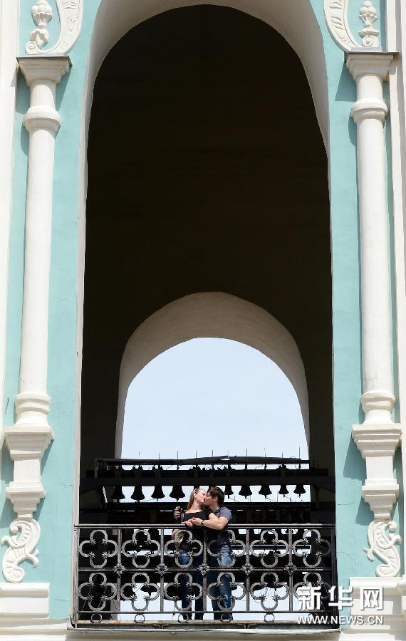 基辅基辅位于乌克兰中北部,第聂伯河中游,为乌克兰首都,全国的经济、文化中心。基辅已有1500多年历史,古老的乌克兰文化就在这里形成。基辅的圣索菲亚大教堂和彼切尔洞窟修道院皆被联合国教科文组织列为世界遗产,而现代重要地标之一是位于第聂伯河右岸卫国战争博物馆前的祖国之母巨型雕像。2012年欧洲足球锦标赛期间,D组的三场小组赛、一场四分之一决赛以及最后的决赛都在基辅举行。图为6月15日,一对情侣在基辅圣索菲亚教堂的钟楼上亲吻。 新华社记者马宁摄