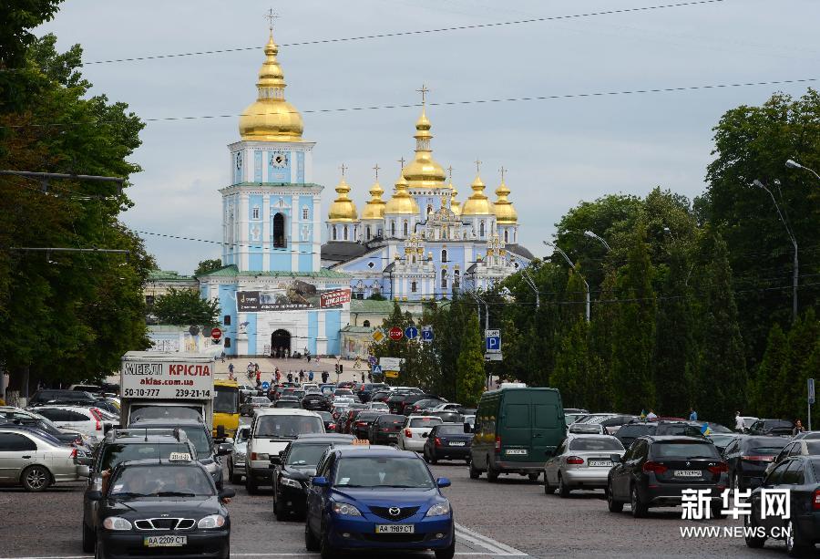 基辅基辅位于乌克兰中北部,第聂伯河中游,为乌克兰首都,全国的经济、文化中心。基辅已有1500多年历史,古老的乌克兰文化就在这里形成。基辅的圣索菲亚大教堂和彼切尔洞窟修道院皆被联合国教科文组织列为世界遗产,而现代重要地标之一是位于第聂伯河右岸卫国战争博物馆前的祖国之母巨型雕像。2012年欧洲足球锦标赛期间,D组的三场小组赛、一场四分之一决赛以及最后的决赛都在基辅举行。图为6月15日,基辅圣迈克尔金顶教堂前的滚滚车流。 新华社记者马宁摄