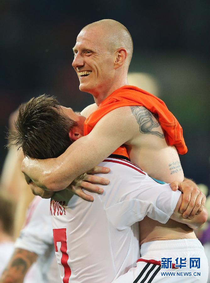 6月9日,丹麦队球员在赛后庆祝胜利。当日,在乌克兰哈尔科夫冶金球场进行的2012欧洲足球锦标赛B组首轮比赛中,丹麦队以1比0战胜荷兰队。新华社记者孟永民摄