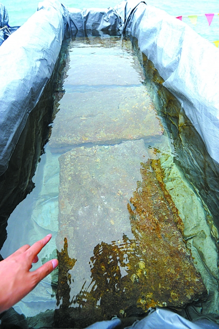 图4:梅园石是宁波特产,是该沉船运输的主要货物。清道光年间,“小白礁Ⅰ号”满载着梅园石和青花瓷,从宁波出发或过境宁波后,在宁波象山附近渔山列岛海域触礁沉没。图为打捞上来的梅园石被安放在发掘平台的水箱里。(新华社发)
