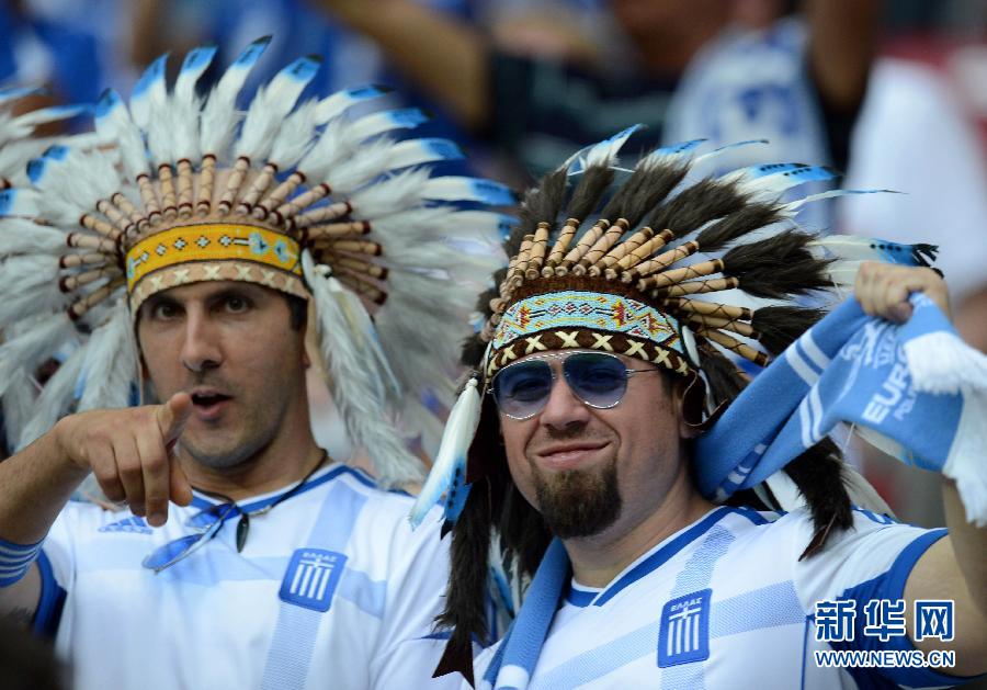 6月16日,希腊队球迷在比赛前。当日,在波兰华沙国家体育场举行的2012欧洲足球锦标赛A组的第三轮比赛中,希腊队对阵俄罗斯队。 新华社记者刘力航摄