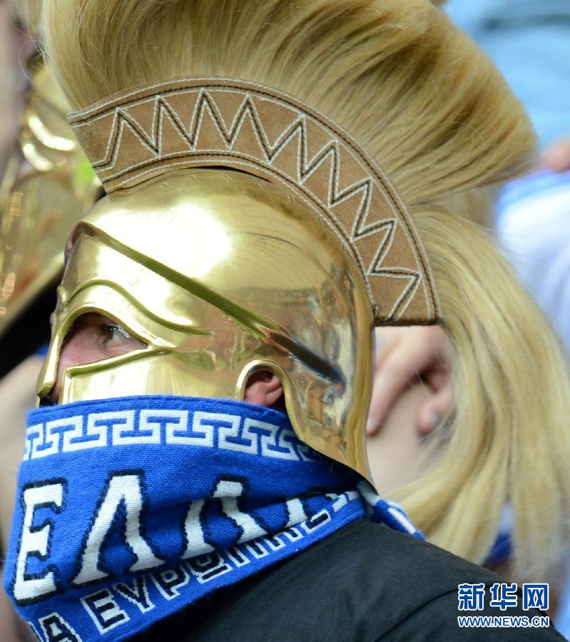 6月16日,希腊队球迷在比赛前。当日,在波兰华沙国家体育场举行的2012欧洲足球锦标赛A组的第三轮比赛中,希腊队对阵俄罗斯队。 新华社记者刘力航摄