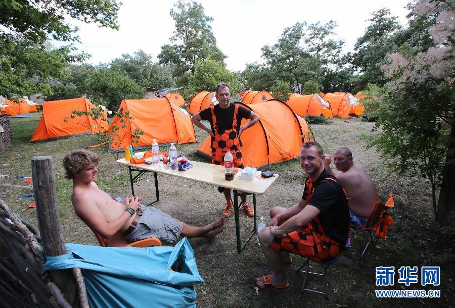 本次欧锦赛荷兰队的三场小组赛都是在乌克兰哈尔科夫市进行,哈尔科夫市在离赛场十多公里外的哈尔科夫湖畔为荷兰球迷开辟出一片区域供球迷生活。很多荷兰球迷驱车来到此地安营扎寨,一方面省去了高昂的住宿费用,另一方面他们聚集在一起共同享受足球的快乐。图为几位球迷在帐篷前休息(6月17日摄)。新华社记者孟永民摄