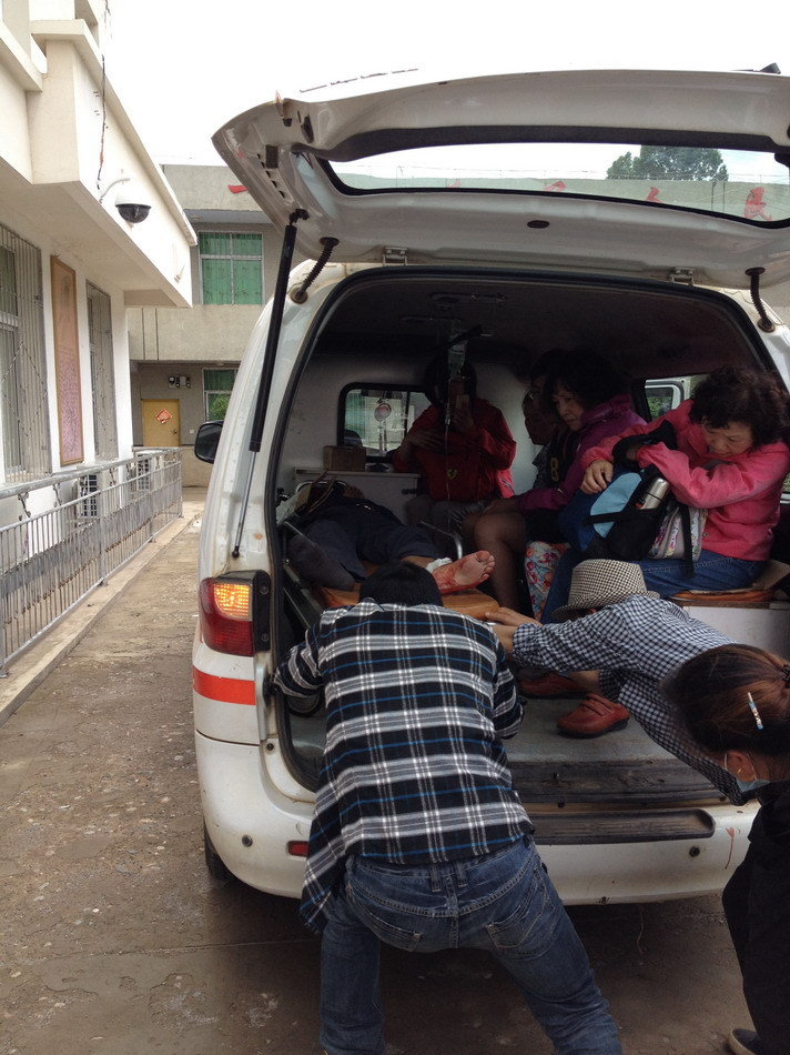 6月24日,在川滇交界处泸沽湖附近游玩的游客被砸伤,伤者被送往医院接受救治。新华社发(尔车摄)