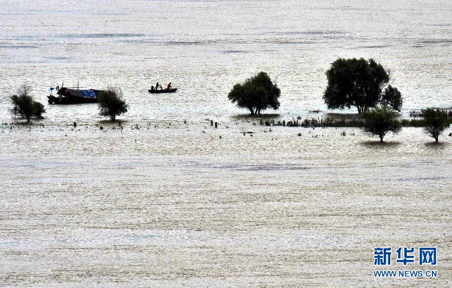 小船行驶在赣江南昌段被水淹的沙洲旁(6月25日摄)。