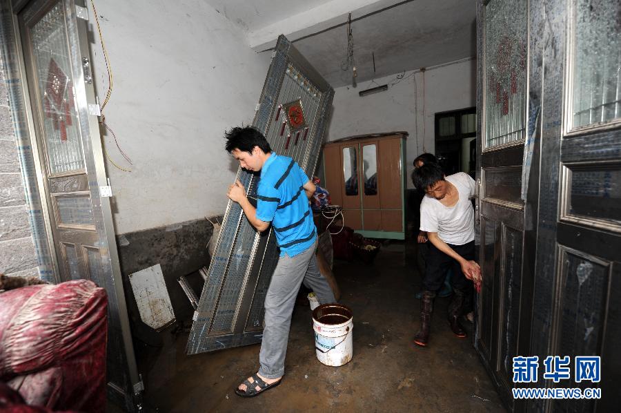 江西广丰县桐畈镇溪山村村民在清理遭洪水冲击的房屋(6月25日摄)。