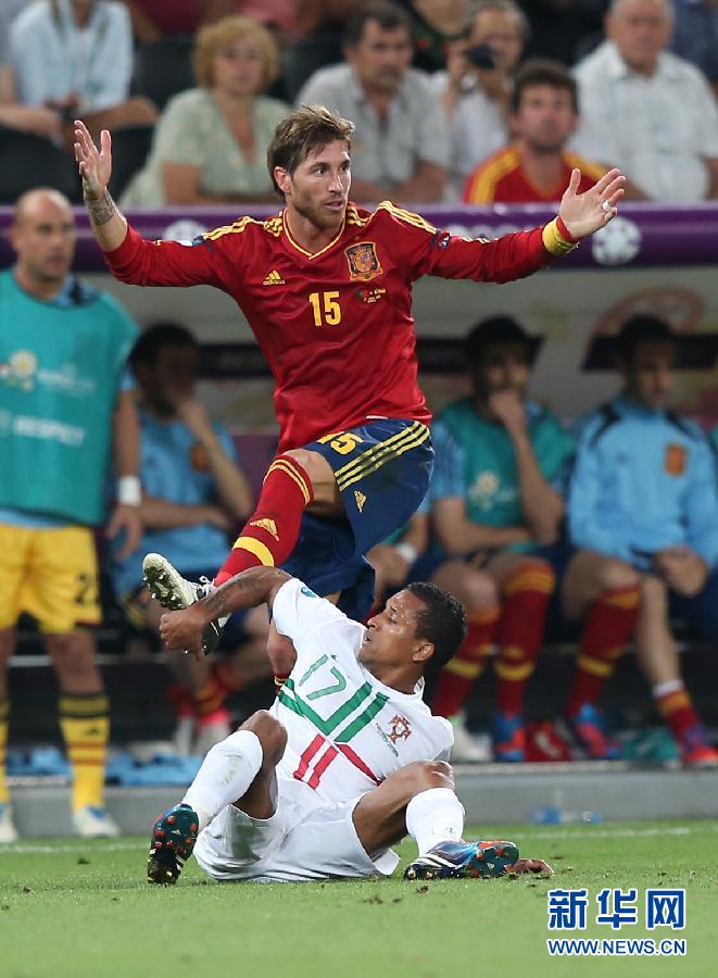 6月27日,葡萄牙队球员纳尼(下)在比赛中托住西班牙队球员拉莫斯的脚。当日,在乌克兰顿涅茨克进行的2012欧洲足球锦标赛半决赛中,西班牙队与葡萄牙队在120分钟的比赛中战成0比0平。在点球大战中,西班牙队以4比2战胜葡萄牙队,晋级决赛。新华社记者孟永民摄