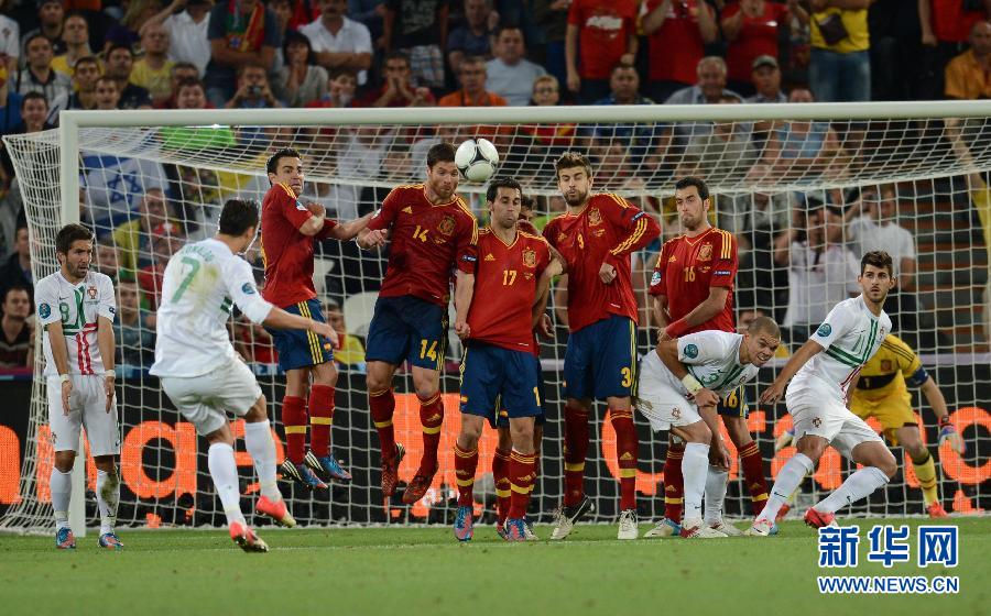 6月27日,西班牙队球员在比赛中防守葡萄牙球员克·罗纳尔多(左二)的任意球。新华社记者李俊东摄