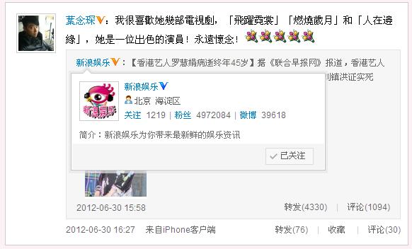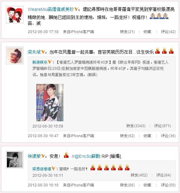 港星罗慧娟胰脏癌去世 群星微博悼念(图)