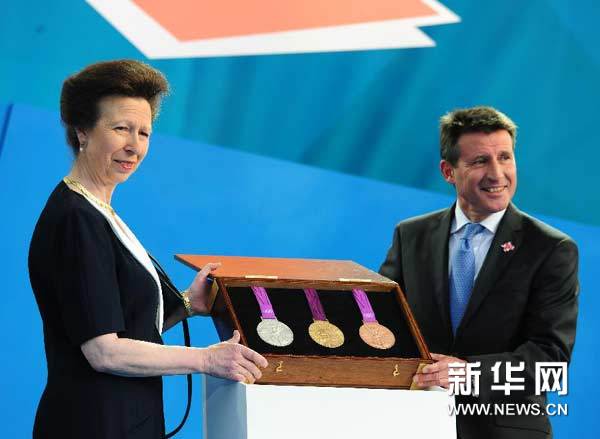 7月27日,在英国伦敦,伦敦奥组委主席塞巴斯蒂安·科(右)和英国安妮公主在伦敦奥运会倒计时一周年庆祝活动上展示伦敦奥运会奖牌。当天,伦敦市中心的特拉法加广场举行盛大活动,庆祝2012年伦敦奥运会进入一周年倒计时。伦敦奥运会奖牌在活动上首次亮相。新华社记者曾毅摄