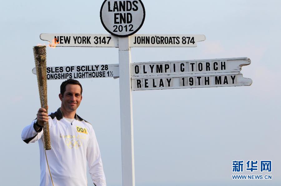 5月19日,英国境内第一棒火炬手本·安斯利在英国西南端兰兹角的地标指示牌前高举点燃的火炬。奥运圣火于5月18日抵达英国。5月19日,在英国西南端兰兹角的地标指示牌前,开始70天的伦敦奥运火炬传递。圣火抵达英国后的第一棒火炬手是三届奥运会帆船金牌得主本·安斯利。兰兹角就在安斯利出生的康沃尔郡。新华社记者殷刚摄