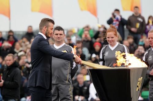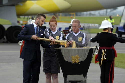 贝克汉姆(左一)用圣火引燃的火炬点燃了安放在飞机跑道上的一个圣火盆。