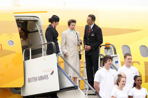 英国安妮公主(中)手持储存着火种的容器走下飞机。
