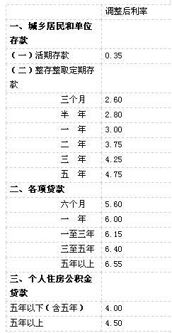中国人民银行决定,自2012年7月6日起下调金融机构人民币存贷款基准利率。金融机构一年期存款基准利率下调0.25个百分点,一年期贷款基准利率下调0.31个百分点;其他各档次存贷款基准利率及个人住房公积金存贷款利率相应调整。