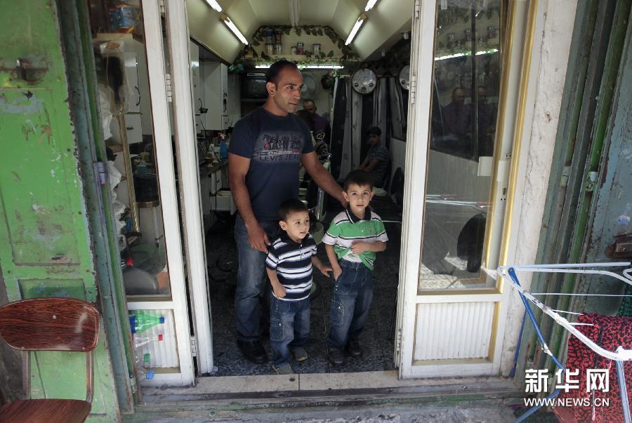 6月22日,鲁迈拉(左)与两个儿子在理发店内。巴勒斯坦柔道选手马希尔·阿布·鲁迈拉将参加2012年伦敦奥运会柔道项目男子73公斤级比赛。届时,他将成为历史上首位通过奥运积分而不是主办方邀请得以在奥运赛场征战的巴基斯坦运动员。新华社/路透