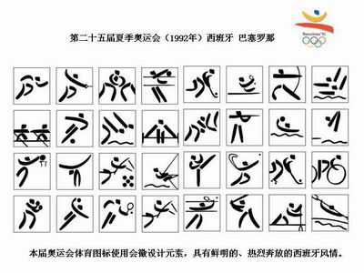 本届奥运会体育图标使用会徽设计元素,具有鲜明的、热情奔放的西班牙风情。