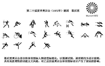 慕尼黑奥运会首次将体育图标人物造型标准化,以强调识别,通用简约为设计原则,具有高度理性的功能主义风格,对之后历届奥运会体育图标设计产生了深远的影响。