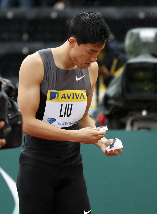 7月13日,中国选手刘翔在预赛后揭下道次标。当日,在英国伦敦水晶宫体育中心举行的国际田联钻石联赛伦敦站110米栏预赛中,刘翔以13秒27晋级决赛。 刘翔的教练孙海平说,刘翔在预赛结束后,肋部略感不适,为慎重起见,决定退出决赛。不过,他的伤情不重。 新华社记者王丽莉摄