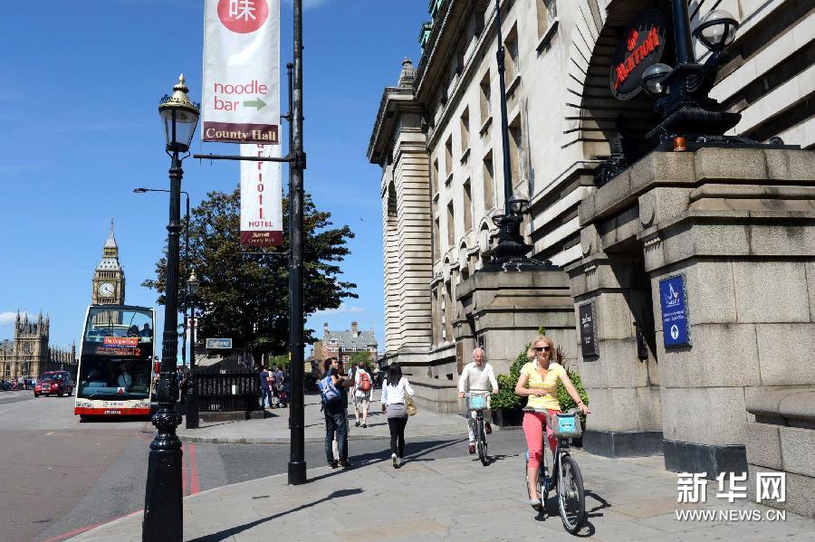 7月22日,伦敦市政厅万豪酒店外人流如织。伦敦市政厅万豪酒店坐落泰晤士河畔,临河的房间可以看到大本钟等景点,奥运会期间的房价在480英镑左右。新华社记者郭勇摄