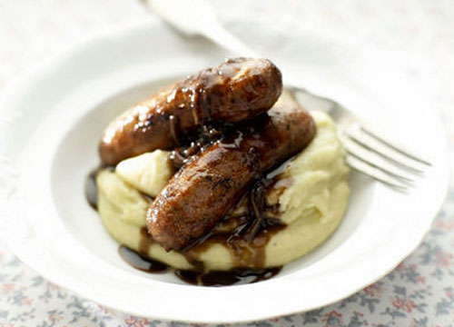 英国酒吧点单率极高的一道菜,几乎每家都有,是香肠和土豆泥(sausage and mash)、香肠主要以湖区特产的坎伯兰香肠(Cumberland sausage)为最佳选择。通常一份是3根香肠铺在大量土豆泥上,或是一长条的绕成圆圈的香肠。因为土豆在英国被看作是主食之一。然后淋上相当于英国“耗油”的洋葱牛肉汁(Gravy)。也有的地方,配合当地的特色,加入了派(Pie)或布丁。